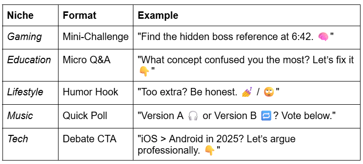 Playful polarity triggers debate. Lifestyle creators report up to +38% more replies when they pin humorous, audience-driven questions instead of generic CTAs.