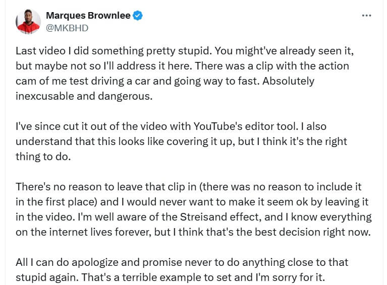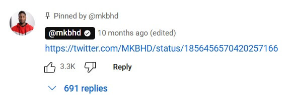 MKBHD addressed backlash over a speeding clip by removing it and pinning a comment to acknowledge the change, an example of using pins for reputation/trust, not just engagement.