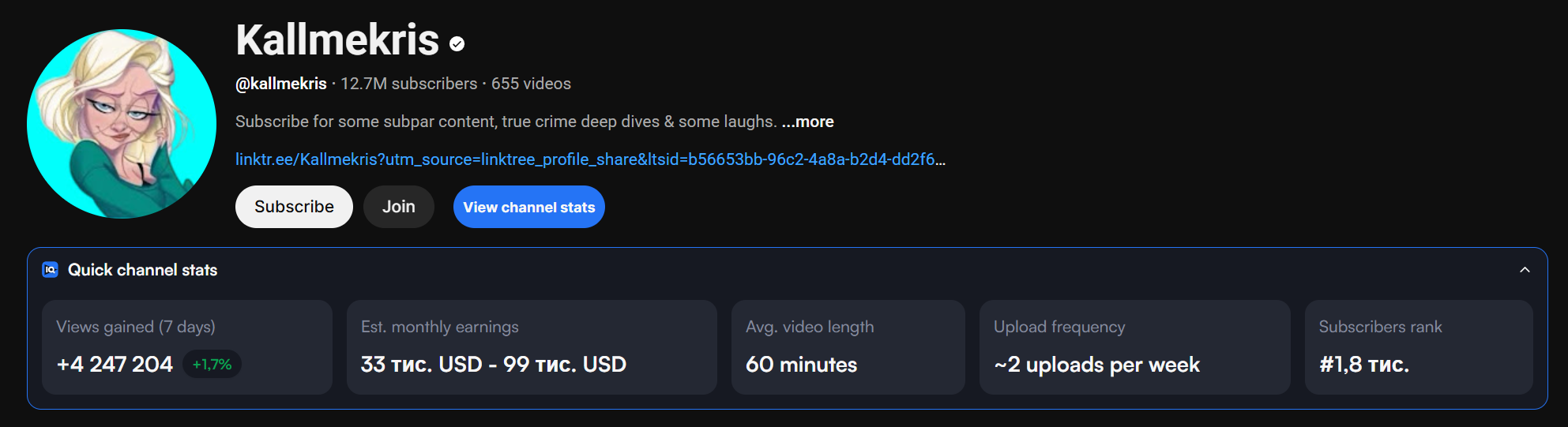 Ahora, pasemos a los canales que lo lograron. Kallmekris comenzó como estrella en TikTok en 2020, en el apogeo de la pandemia. Era más conocida por sus sketches que duraban de 30 segundos a 1 minuto. Se convirtió en una sensación de la noche a la mañana. En solo un año, Forbes catalogó su canal como el quinto de mayores ganancias con 4.75 millones de dólares.