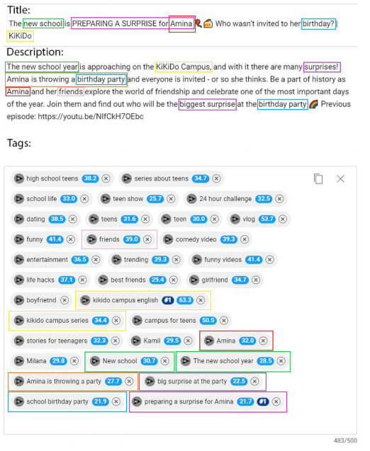 - Tags de média frequência – específicas de nicho/categoria: “série sobre vida escolar”, “desafio de 24 horas para crianças”, “lavagem de carro de brinquedo.”