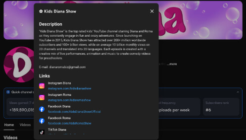 “Kids Diana Show" é o canal infantil mais bem classificado no YouTube, estrelado por Diana e Roma, que constantemente se envolvem em aventuras divertidas e malucas. Desde o lançamento no YouTube em 2015, Kids Diana Show atraiu mais de 200+ milhões de assinantes em todo o mundo e 100+ bilhões de visualizações, com uma média de 10 bilhões de visualizações mensais em 20 canais e traduzido em 20 idiomas. Cada episódio é criado com uma mistura criativa de performances ao vivo, animação e música para criar vídeos de comédia para pré-escolares.