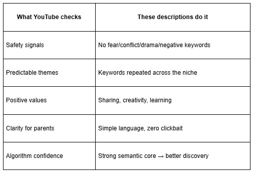 Uma boa descrição para um canal de conteúdo infantil no YouTube deve cumprir cinco critérios: