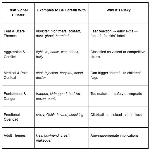 O que realmente acontece é que o YouTube executa classificadores de segurança em seus títulos + miniaturas + vídeos. Se eles detectarem sinais repetidos de estresse/conflito, seu conteúdo recebe: