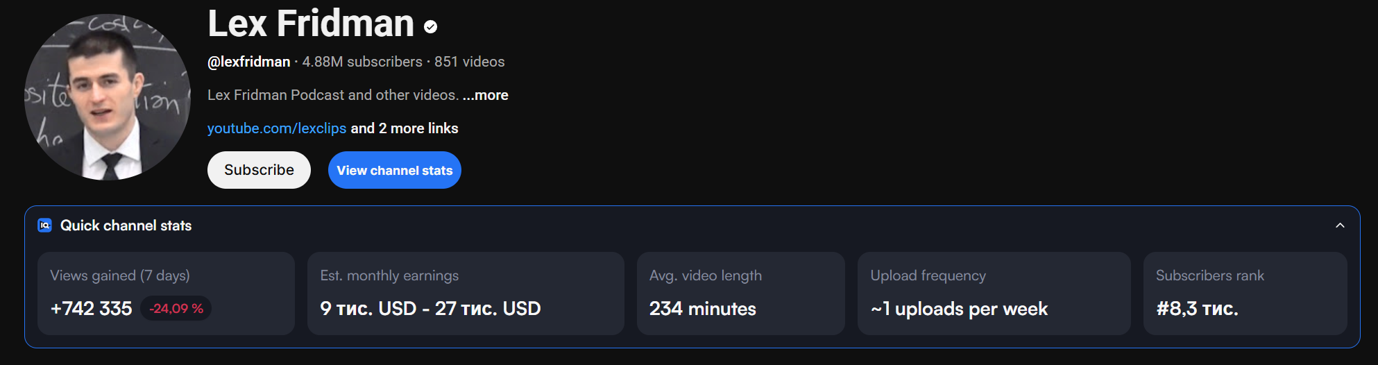 Подкаст Lex Fridman - це глибокий занурення у світ технологій, штучного інтелекту, філософії та людської поведінки, проведений уважним і методичним Лексом Фрідманом, дослідником ІІ та професором Массачусетського інституту технологій. Ведучий досліджує деякі з найбільш складних тем в науці, етиці та технологіях, одночасно пропонуючи людську перспективу на те, як ці сфери перетинаються з повсякденним життям. Подивімося, наскільки успішними вони є: