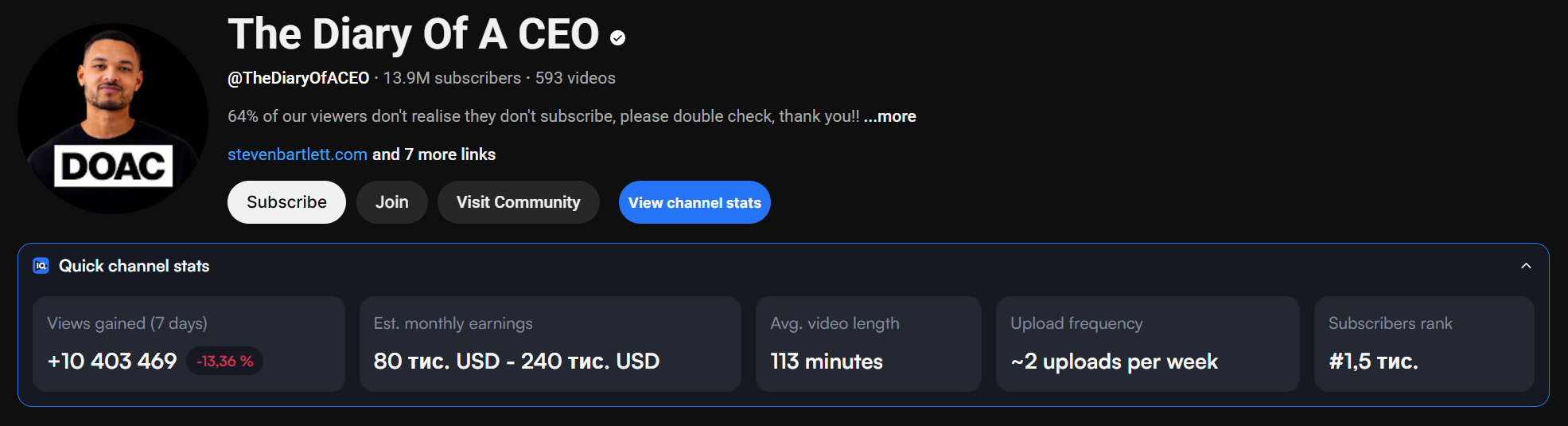 Це ще один приклад подкасту, що знайшов успіх в освіті та, певною мірою, суперечках. Diary of a CEO цікаво дивитися в основному завдяки гостям, яких він запрошує на шоу і обговорюваним там темам. Погляньте на його успіх: