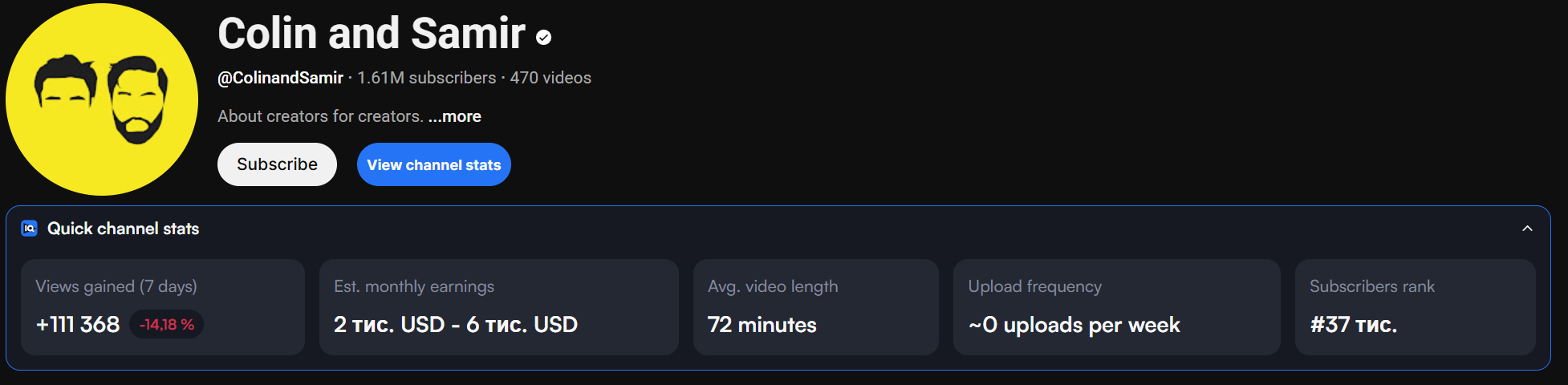 Тепер поговоримо про творців, які зробили своєю життєвою місією пояснювати економіку творців з повагою. Колін і Самір, творці The Colin & Samir Show, заглиблюються в YouTube, як це працює, його трюки та хаки. Є багато цікавого матеріалу, як для новачків, так і для досвідчених творців.